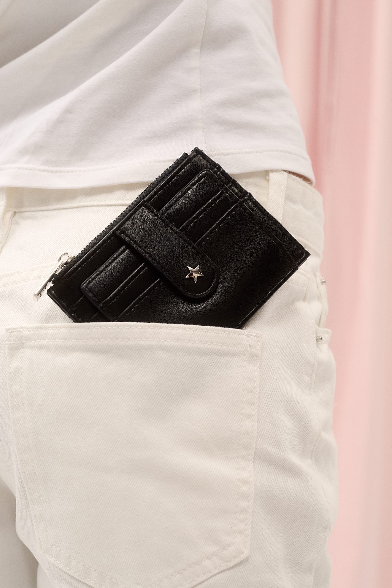 The Daisy card case is made from matte black faux leather. This style features a press stud closure, five card slots, one photo / clear card slot perfect for your ID, a zipped coin and notes compartment and one wide card slot on the reverse side. The Daisy is the perfect size to carry in your hand, small handbags and your pocket.